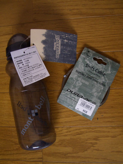 これから暖かくなると水分補給は必須ということでモンベルの“スクリュートップサイクルボトル”を購入。去年246号線で落下させて車に踏みつぶされてしまったので…。キャップつきで容量は700ml、ポリプロピレン製なので匂いがつきにくそうだ。それとシマノ、ステンレスシフトケーブル(DURA-ACE)を購入した。シフトケーブルはMTB、ロードで互換性があるようだ。