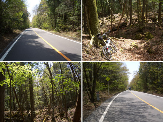 道の駅鳴沢を出て富士ヶ峰方面に左折すると交通量も減った。坂を上り乗馬施設脇を抜けると富士原生林(青木ヶ原樹海?)などという立て札のある緑深い道を走行していく。割と大型車両の通行が多くセンターラインを越えて追い越していく。アップダウンをこなしながら先へと進むとハイキングコース?登山道?だったかの入口で補給休憩。溶岩石がごろごろとしていて鬱蒼とした森の中といった感じで少し神秘的。