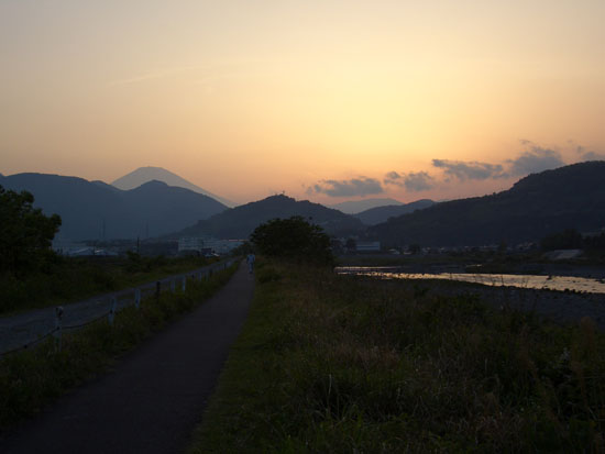 夕暮れ時の酒匂川サイクリングコースを走行していく。振り返ると山並みのむこうに富士山のシルエットも綺麗に浮かんでいた。