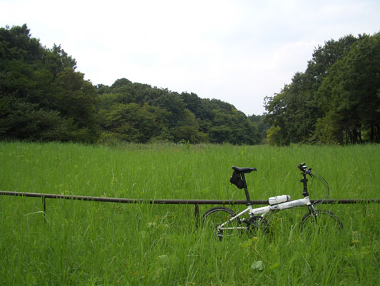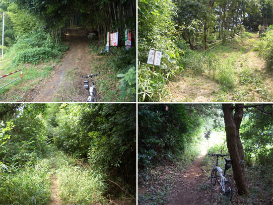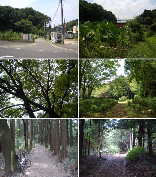 尾根みちを自転車を押してのぼって行く。とまると蚊がまとまわりつくので速歩でどんどんと先へいくことにした。結構鬱蒼とした森だ。鳥や蝉の鳴き声を聴きながら進んでいく。いくつかの休憩所をすぎて通りに面した分岐点にでる。尾根みちはさらに右折して通り沿いに続いていたが今回はここで離脱して若葉台方面に下ることにした。