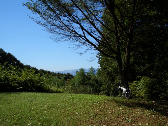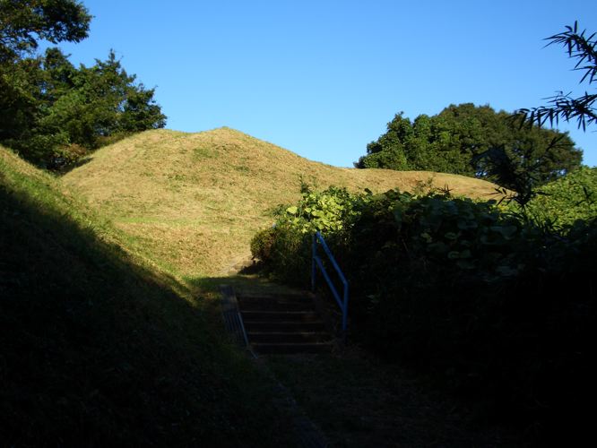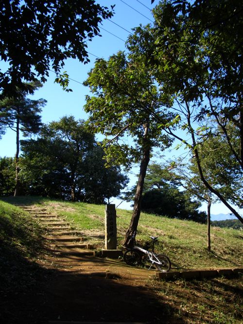 市が尾高校のあたりでいったんコースを出て稲荷前古墳に向かうことにした。上麻生線を渡り直進して突き当たりを左折して進んで行くとほどなく看板が見えたので自転車を止めて入口の階段を上って行くとラクダのこぶのような古墳が目の前に現れた。特に何も注意書きはないので古墳の上に上ってみると前方に街並みと遠く山波のあいだに富士山の頭がちょこっと顔をだしていた。しばらく休憩してからコースに戻ることにした。