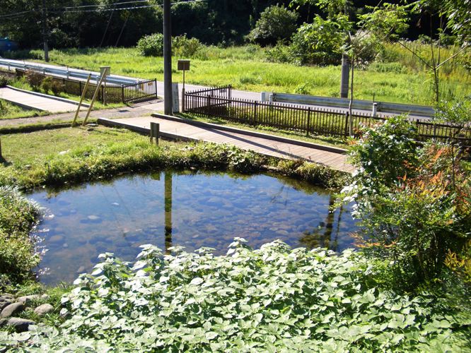 整備された池をのぞき込んでみると確かに水が湧き出ているがなにか作りものすぎているようだ。しばし休憩後に付近を観察してみると広場脇にも水が流れていてどうやらまだ上のほうに水源があるらしい。しかし、これより先私有地のため立ち入り禁止とあるので辿ることはしなかった。このあたり一帯の丘陵が源なのだろう。