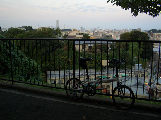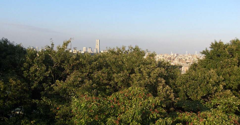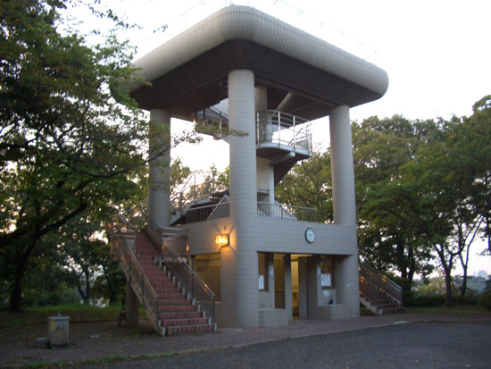 展望台の手前右あたりに階段があった。すでに4時半過ぎとなっていたので急いで(土日祝日は5時閉館ということで)自転車は遊歩道脇に駐輪して下っていくとお墓が目に入ってきた。まだ蝉も鳴いている。この公園はもとは弘明寺の境内だったということだそうだ。4時40分すぎとぎりぎりな時間になんとか到着しささっと本を探して借りてから再び階段をのぼって遊歩道にでる。10mほどさらにのぼると展望台のある広場にでた。