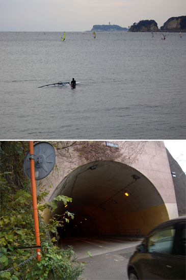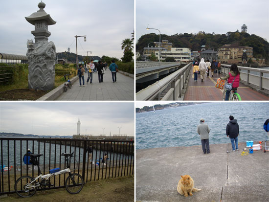 サーフィン大会が催されている脇を通り抜けて鵠沼橋を渡り湘南海岸公園内をとろとろと走行する。久し振りに江ノ島に上陸してみようということで弁天橋を渡るが休日ということもあり混雑していて人にぶつからないように慎重に走行し灯台方面に向かう。灯台横の公園に出てみるが今日は風が強い。