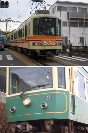 江ノ電腰越駅の手前あたりで一本裏の道に入ると前方からタイミングよく電車がきた。あれ?ちょっと変わった色合いの江ノ電だな…サンライン号なんて書いてあるけどちょっと違和感があるけどまあこれはこれで良いのかな…。このあたりは路面電車のような軌道の区間となっていてすぐ横を通過していくので何故かちょっとわくわくするなあ。