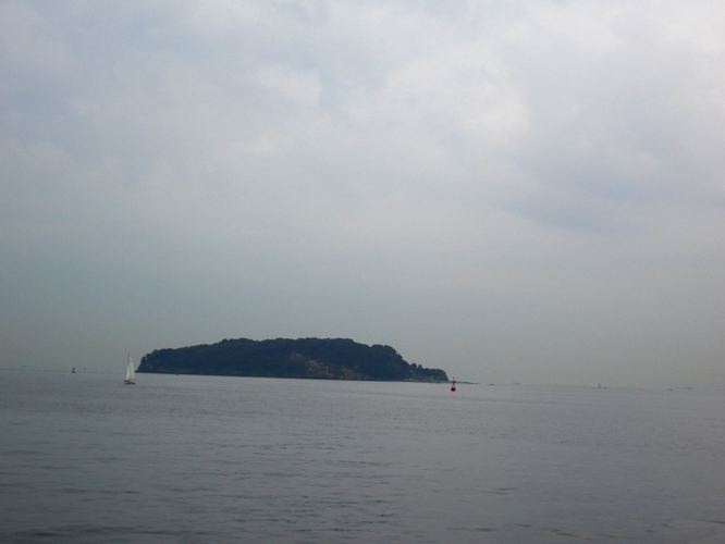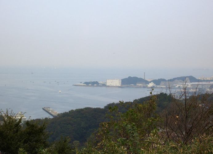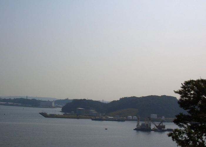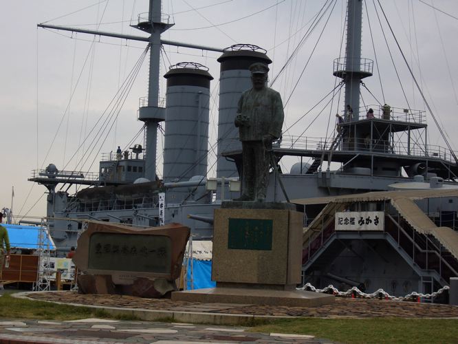 更に先の三笠公園へ向かう。途中に米軍基地のゲート前を通過し三笠公園に到着すると何か催しが行われていた。原子力空母配備反対の集まりのようであった。戦艦三笠と東郷平八郎の像の前で写真をとったあと港を眺めると遠くに猿島が浮かんでいた。