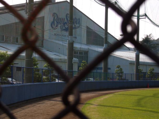 引き返して田浦方面へ向かう途中R16号線と合流し左に分岐している道があったので進んでみる。このあたりは自衛隊関係や港湾施設等が立ち並んでいてやはり立ち入り禁止となっており長浦港にはでることができなかったのでトンネルを抜けて先へ進むとプロ野球の横浜ベイスターズの練習があったので少し覗いてみることにした。柵で覆われたグラウンドの奥からは横須賀本港が望めた。ここも左右に自衛隊関係の建物があった。