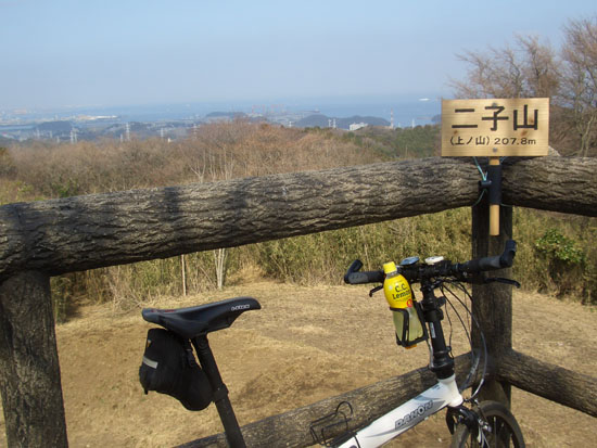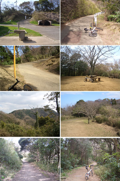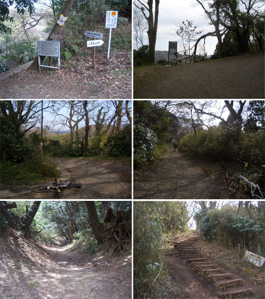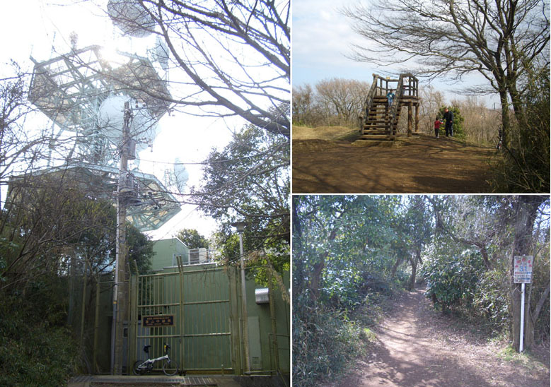 砂利道となり走り辛くなったので押し歩き、前方に外国人の親子が見える。ちょっと急な坂道があらわれたので押して行く。森戸川、東逗子駅の分岐地点のある急なカーブ。ここを曲がると森戸川に降りられるらしいが今回はやめておくことにした。さらに急坂が現れカーブを曲がり振り返ると東京湾が見晴らせてきた。もうだいぶのぼってきたようだ。外国人の親子が引き返してきた。さらにのぼると前方に無線中継アンテナが見えてきた。わりとあっけなく頂上付近まできてしまったようだ。
