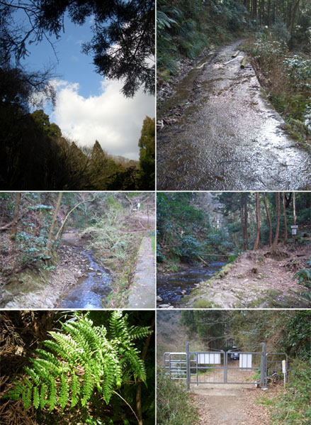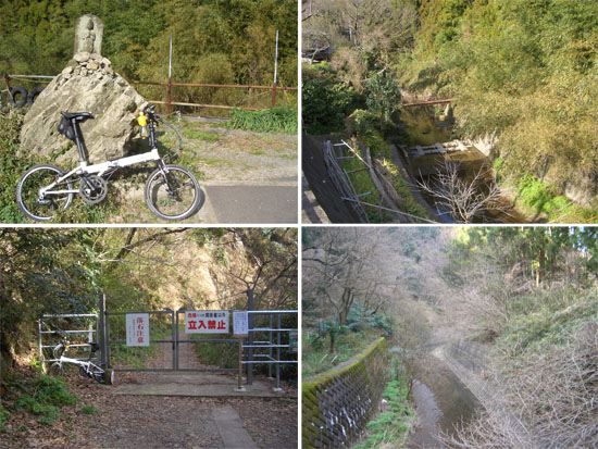 南郷交差点を左折して川久保交差点を左折、迷走しながら民家脇を抜けて森戸川沿いにでる。右手にcofeeという看板がでている建物がある(喫茶店かな)。さらに川沿いを行くと橋の先が大きな水溜まりになっていた。どうしようか、日も傾いてきたし今日はもう帰ろうかなと思ったが折角ここまできたのだからいけるところまでいってみようということで水溜まりを越えて先へ進むとほどなく林道のゲートが現れた(1438)。なにやら崖崩れがあり通行止めとの注意書きある。