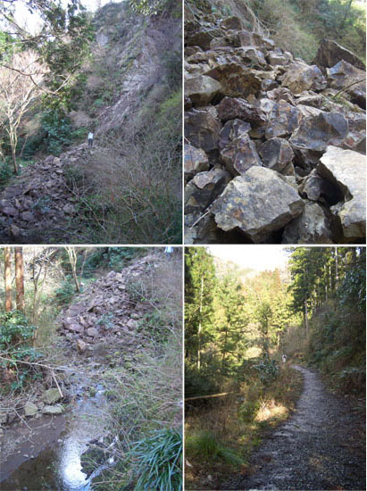 しばらく歩くと前方に崖崩れの現場らしきものが見えてきた。かなり大きく崩れている。乗り越えてくる人がいたのでちょっと待って道の様子をたずねてみると先のほうは問題ないらしい。ということで崩落した岩を足もとに注意しながら越える。