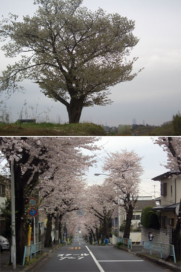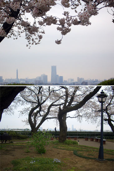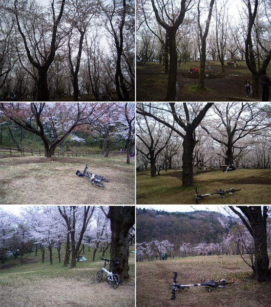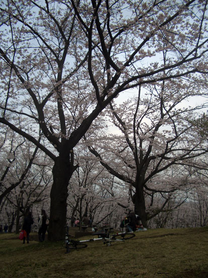横浜新道脇の道を気持ちよく下ってのぼり東戸塚駅西口前へでる。戸塚カントリークラブへむけて再び上りだ。こっち側から上ったほうが減速舗装も気にならなくなるのでよいかな。ほどなく左手に桜が見えてきた。こども自然公園に到着したようだ。脇の入口から自転車を押していく。斜面に大量の桜が植えてあって綺麗。天気が悪いとはいえ休日の昼すぎなのでさすがに人出も多い。一息ついて上までのぼってみることにした。えっちらおっちらと自転車を押し歩いてほどなく頂上付近に到着。ちょうど桜も見頃で良い感じだ。