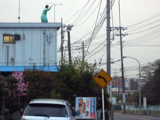 左手前方の屋根の上に人影が…と思ったらなにやら店のディスプレイなのかな…。