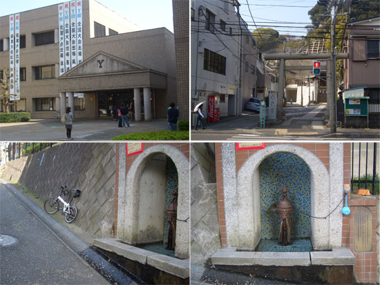 井土ヶ谷橋で地図を確認するとこの近辺から清水ヶ丘公園にいけそうということでとりあえずわかりやすそうなルートでということでUターンすることにする。Y高(横浜商業高校)前を通って交番前の信号を渡り神社(水天宮と書いてあった)脇の細い路地に入る。ほどなく丸舗装の激坂となる。右手に獅子頭共用栓という先週行った水道記念館にもあったものがここにも設置してあった。ここのは水が出っぱなしになっているので湧水なのだろう。ちょっと暑くなってきて汗をかいたので顔を洗わせてもらう。