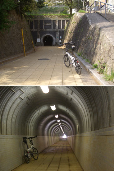 自転車は降りて通行して下さいとの看板がでていたので引いて中に入っていく。トンネル内はやや冷んやりとしていてトタン張りとなっている。天井に蛍光灯がついていて異次元の世界への入口のような独特な雰囲気だ。まあ扇島の海底トンネルほどではないがやはり暗いうちに通行するとちょっと怖そうだな。