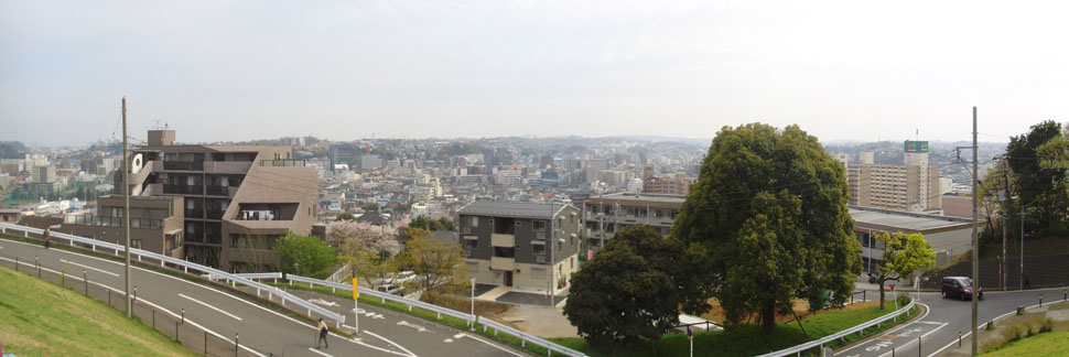 トンネルを抜けてすぐ左手のスロープをのぼっていくと大きな広場にでた。多くの子どもや大人が思い思いにはしゃぎまわって遊んでいる。さらにスロープをのぼりプール前を通過して高速道路上の橋を渡ると何やら手旗信号の旗を振る練習をしている一団がいる。前方の丘の上には一本ぽつんと木が立っているのが印象的だ。桜の木も数は少ないがいくらかあった。自転車を押して丘の上までのぼってみると展望が開けていた。南側なので上大岡、磯子方面あたりだろうか。