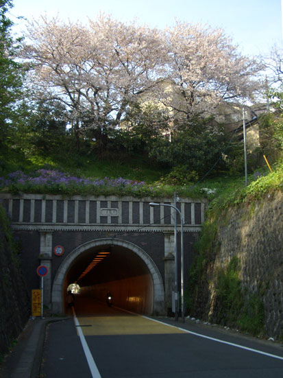 ということでもときた道を引き返して先程の大原トンネル前まで戻る。通りにでて二差路の信号で左折するとほどなく東トンネル前にでた。ここは自動車も通行できる普通のトンネルだ。トンネル上には桜が咲いていて綺麗。