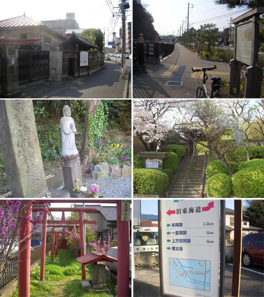 ここから先もまだだらだらとのぼっていく。境木中学校あたりで大通りに合流し右折すると見覚えのある境木地蔵尊前にでた。ここには武相国境之木の碑が建っていた。武蔵の国と相模の国の境ということだ。ここを直進すると先日上ってきた東戸塚駅方面、今回は左折して細い道を下って上り下ってとアップダウンを繰りかえして品濃一里塚前に到着。上が公園になっているようなのでのぼってみると親子連れと、ラジコンで遊んでいる少年がいた。奥には小規模な市民菜園のようなものがあり菜の花が植えられていた。引き返して再び旧東海道沿いをすすんでいくとほどなく品濃坂という案内板がある。丸舗装の急坂を下る。ぼんやりと大山の頭が見えている。晴れて空気が澄んでいれば富士山も見えるのだろう。ここからは陸橋で環状2号線を渡るようだが向こう側の階段にはスロープがないようなので自転車は担いで降りなければならないようだ(自転車の場合は環状2号線まで下って環2平戸の信号を渡ればよさそう)。