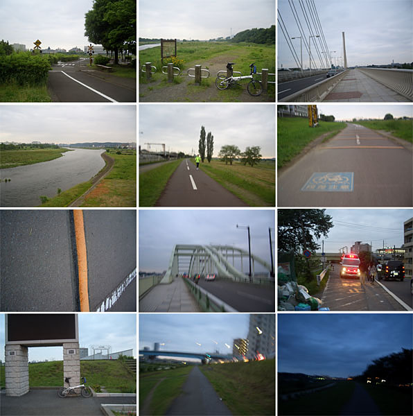 ガス橋で川沿いを離れて平間駅前にでる。駅前あたりはちょっと渋滞していて道も狭いので走りづらい…。踏切渡り直進していくと強引に右折しようとする車両が…慌てて急ブレーキ、危ない危ない渋滞していてスピードが出ていなかったのでよけられた。袴線橋を渡り鷹野大橋まで走行するが鶴見川沿いは暗そうということでそのまま直進して環状2号線にでて午後7時半すぎに無事帰宅した。結局、雨は朝方にちょっと降っただけだったようで走行には全然影響はなくて良かった。ちょっと曇っていてどうかなと思ったけど自転車で走行するにはほどよい気候だったかな。