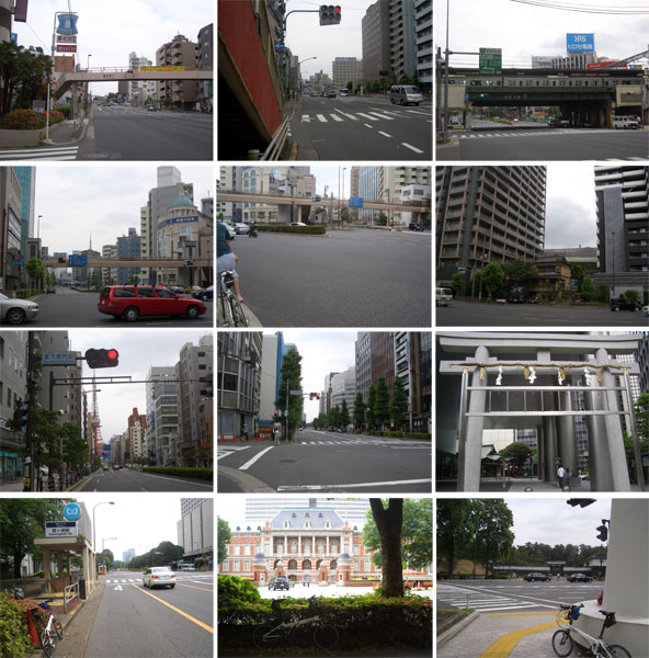 環八矢口陸橋、池上と通過し馬込あたりのアップダウンをこえて戸越、目黒川を渡り五反田駅前に到着(0840)。駅前からやや長めの坂をのぼり高輪台、明治学院前あたりの下りで東京タワーがちらっと前方に見える。白金1の交差点はやや複雑…横断歩道もないけどとりあえず二段階右折してそのままR1、三田で右折し慶應大学横あたりから正面に東京タワーが見えたのでちょっと歩道にあがって小休憩(0857)。赤羽橋から飯倉まで無駄にのぼると交通整理らしい警官が立っている。虎ノ門手前で鳥居が見えたので歩道にあがってみる。金刀比羅宮というらしい。ここまでくれば皇居まで目と鼻の先だ(0910)。虎ノ門から官庁街を抜けて桜田門前に無事到着(0921)。