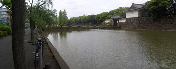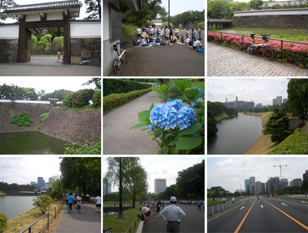 ということで家をでてから1時間48分ほどかかったようだ。休憩なしで急げば1時間半ぐらい、のんびり休憩しながらでも2時間あれば来られるかな。R15経由より若干(2kmほど)距離が短いけどややアップダウンありという感じ。ちなみに距離は27kmほどか。皇居に着くとなにやら次々とゼッケンナンバーをつけたランナーが走りすぎていき賑やかだ。どうやらマラソン大会らしい…。広場脇のトイレで顔を洗わせてもらう。暑い…。パレスサイクリングはまだ始まっていないらしく普通に車が通過していくのでとりあえず皇居の歩道を反時計回りに一周してみることにした。