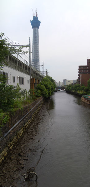 写真撮影などした後、さらに北十間川沿いに下ってみる。車通りも少ないのでのんびり走行していく。振り返ってみると建設中のスカイツリーが聳えていてなんだか不思議な光景。