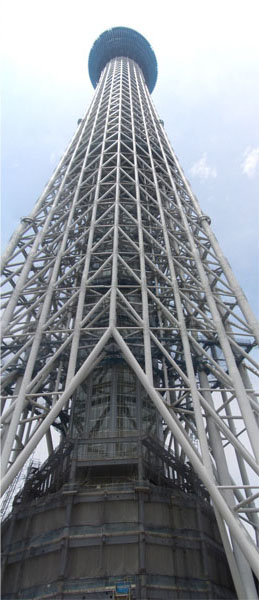 今回はランドマークタワーを抜いて日本一高い建築物になっているという建設中の東京スカイツリーの様子を見にいってきた。東京都内を走るのはずいぶんと久し振り。休日の午前中ということもあり交通量もほどほどでまずまず走りやすかった。外はどんよりとした曇り空だけど日中いっぱいはもつとのこと…まあどしゃぶりじゃなければ都内なら駅もあちこちあるし(乗り換えは面倒そうだけど)心配ないだろうということで午前7時半すぎに出発。