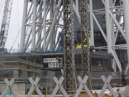 川沿いに走行してスカイツリーの真下あたりに到着。大混雑というほどでもないけどなかなかの込み具合。現在の高さ398mと表示されていた。展望台らしきかたちのものがありマリンタワーの親分といった感じになっている。