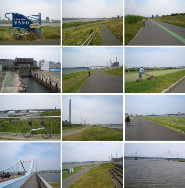 複雑な形の江北Jct?下をとおりぬけ鹿浜橋をくぐり土手上にのぼると車止めがある。芝川水門に到着(1435)。右手にレストランさくらという食堂がある。芝川水門を渡ると埼玉県川口市。追い風に乗って調子よく走行してきたけどそろそろひきかえさないと…ずいぶんと遠くまできちゃったなあ感に浸りながら次の荒川大橋を渡る。岩淵水門付近で中休憩し再び向かい風と闘いながら千住新橋に到着(1530)。ちょっと疲れたので学びピア21で飲料補給などして休憩。