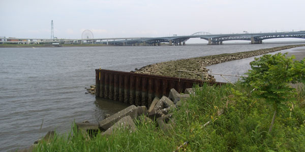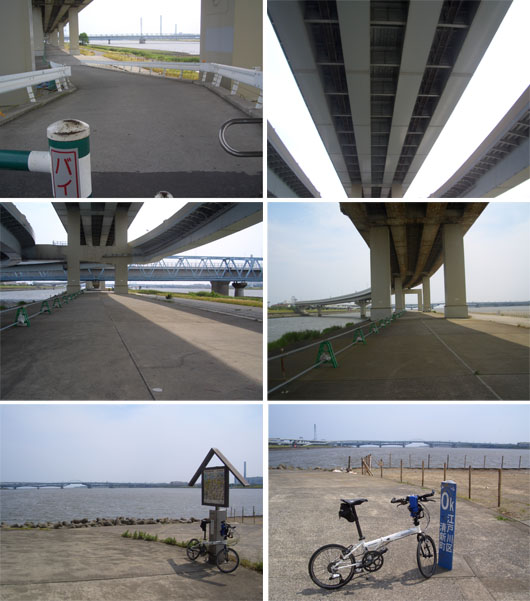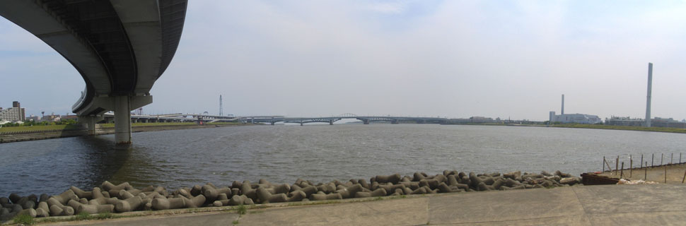 中川の手前から高速道路下の道へ降りる。高速道路下は日陰になっていたので堤防道路まで降りないで走行してみる。コンクリート舗装で時々へんなでっぱりがあったりするのでちょっと危険かも…。ほどなく左岸の河口に到着(1325)。