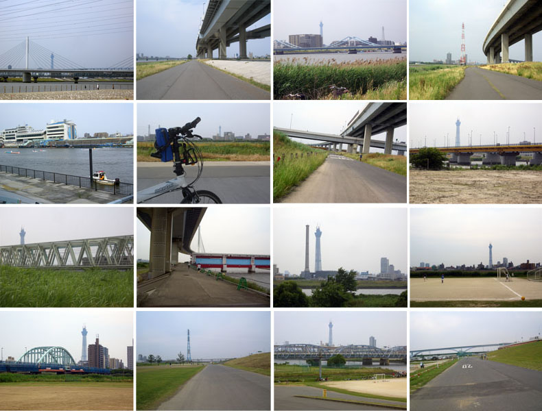 風がますます強まってきた感じ。路面状況は右岸ほど良くないかんじだけど多摩川とくらべれば道幅もあるし人も少ないしゆったりマイペースで走れる感じ。いくつか橋をくぐり走行していくとエンジン音がする。スロープがあって土手上にあがれるようになっていたのでのぼってみる。競艇場で競艇が開催されていた。2~3分眺めてから再び土手下の堤防道路に降りる。さらにいくつか橋をくぐっていく。ときどきスカイツリーが見えたりする。かつしかハープ橋を過ぎると野球やサッカーのグラウンド横を通るようになる。一部ダート部分などもあるが短いので特に問題はない。