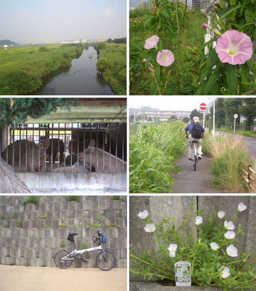 午前7時半すぎに出発。雲が多めだけどすでに28℃と暑い…。新横浜から鶴見川沿いを上流方面に走行していく。途中川和町あたりの豚舎前で写真を撮っていると自転車に乗った年輩の方が声をかけてくる。30年ぶりにこのコースを走ってみたとのこと。その当時は近くに牛小屋もあったらしい。市ヶ尾高校前あたりでお別れしてここから県道にでることにした。