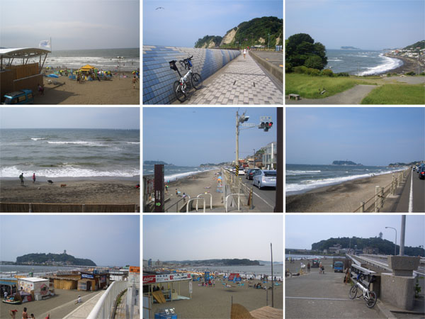 滑川交差点にでると浜辺には海の家が建ち並んでいて海水浴客で賑わっていた(0928)。風が強くて砂粒が顔にあたり痛い。歩道をのんびり走行して稲村ガ崎で小休憩。富士山は見えない。海沿いのR134号線を江の島をのぞみながら気持ち良く走行してほどなく片瀬東浜に到着(1005)。ここも海水浴客で賑わっている。