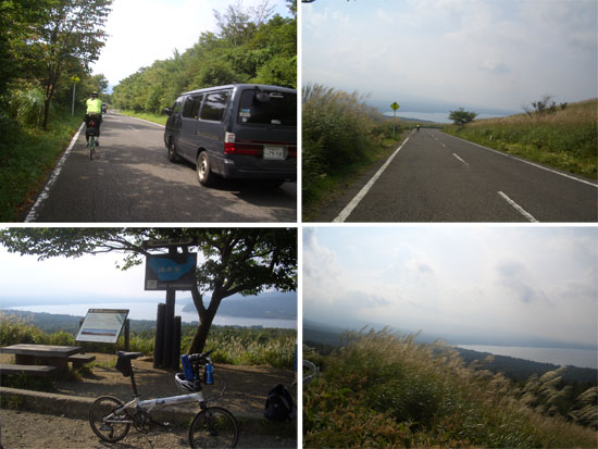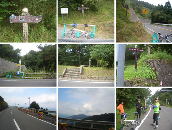 明神峠で再び休憩。すると電話がかかってきた。あと1.5kmぐらいだから頑張ってと励まされる。さあ急がないとということで乗車したり押したりを繰りかえす。林道ゲートを越えて北側の斜面にでた。このあたりもまだまだきつい坂が続いているけどあとひとのぼりということで乗車していくことにする。先程のぼっていったロードバイクの人が降りてきた。「頑張ってみんな待ってるよ」と声をかけてくる。よろよろときついところは蛇行しながらのぼっていく。今度は前方からKさんが降りてきた。ラストスパートといきたいところだけれどももう全然脚が回らない。声援をうけながらようやく峠に辿りついた(1415)。ずいぶん待たせてしまたのかな…。申し訳ないです。