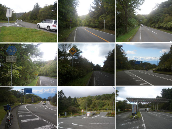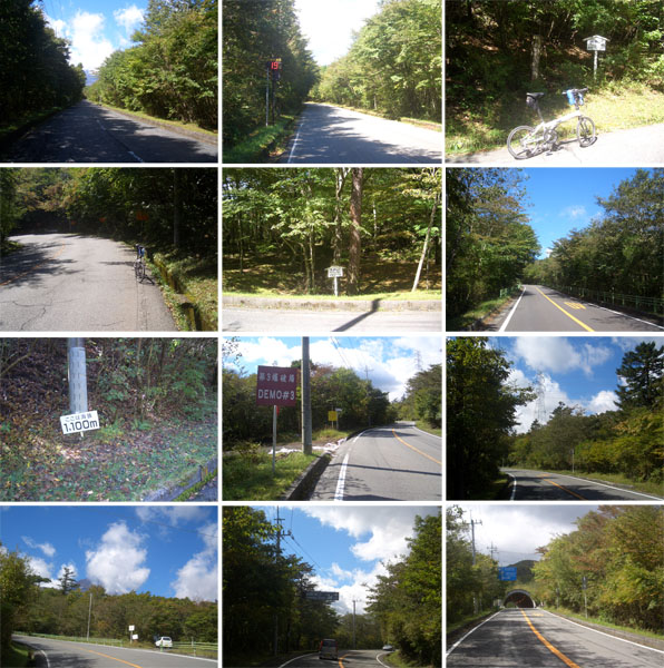 途中の気温表示では19℃となっていたので自転車的には丁度よい気候の中ここまでこれた。ここからの富士山はなかなか見事らしいが今日は雲の中のようだ。40分ほど休憩して出発。ほどなく分岐地点でる(1235)。前方に南アルプス?の山並みが聳えている。右折するとすぐに旧料金所跡、ここから約13kmほどののぼりとなるようだ。
