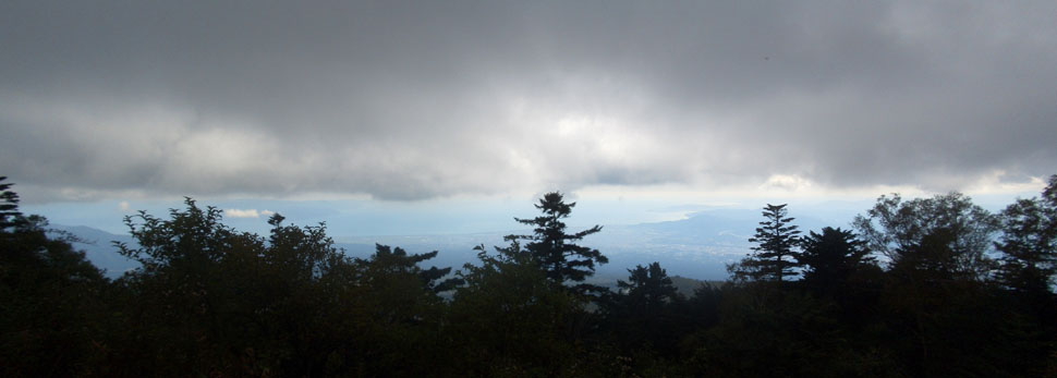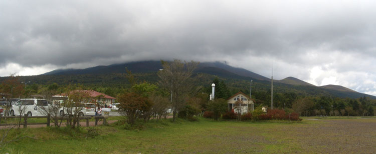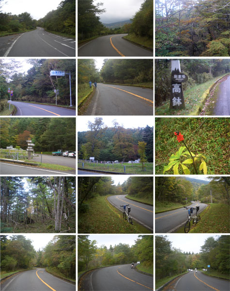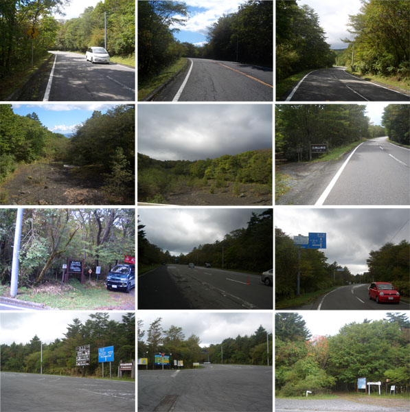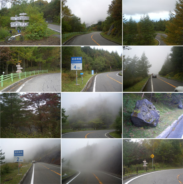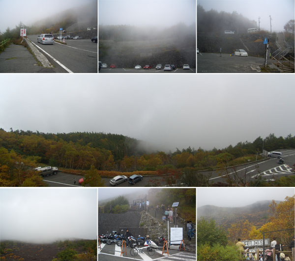 ほどなく七曲り駐車場(標高1,900m)に到着(1400)。このあたりまでくるとずいぶんとのぼったな感がある。三合目(標高2,000m)を通過(1414)。あと4kmの標識あたりから霧が深くなってきた。あと2km地点の看板あたりで道路工事の車両が停車していたが問題なく通れるようだ。四合目(標高2,300m)を通過(1448)。あと少しだ。