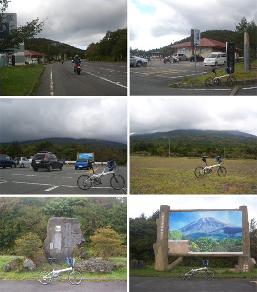 さらにひと頑張りすると新五合目駐車場に到着した(1510)。富士山は残念ながら雲の中…。下界も見えず…。とりあえず展望台までのぼる。奥にある階段へ自転車を担いで登山口標識前で記念撮影。30分ほどうろうろしたりして下山することにした。