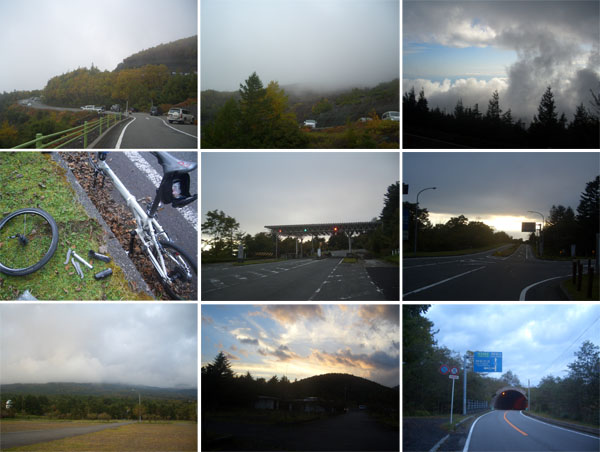 今日は長袖一枚でもそれほど寒くない感じだ。念のためウィンドブレーカーとグローブをして下りはじめる。雲海っぽくなっている景色が綺麗だったのでちょっととまって写真撮影。つづら折れ区間をすぎたところで前輪からプシューと空気が抜けた音が…。停止して道路脇でパンク修理(1600)。前回の明神峠でのパンクと同じ箇所のようだ。そういえばリムテープをまだ替えていなかった。ここからは慎重に下って水ヶ塚公園でトイレ休憩(1655)。床に下痢便が…匂う…。あたりは夕暮れの雰囲気になってきたのでライトを装着しておく。