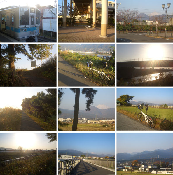 日もだいぶのぼってきた。駅前(東口)で自転車を展開して準備をする。駅前から矢倉岳?の隣に富士山もよく見えている。今日は期待できそう。時刻は7時半となり出発することにする。酒匂川の土手に出て下流へ向けて走行していく。朝日がのぼっていくのを横目にみながら爽やかな早朝のサイクリングコースを走るのは気持ちよい。いくつか橋の下をくぐり抜けて終点の富士道橋に到着。まだ先に道がつづいていたようだけどダートで湿っていてスリップしそうなので土手上にあがる(ここも未舗装だが…)。小田原アリーナ横をぬけると富士見大橋にでた(0753)。