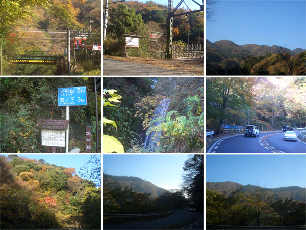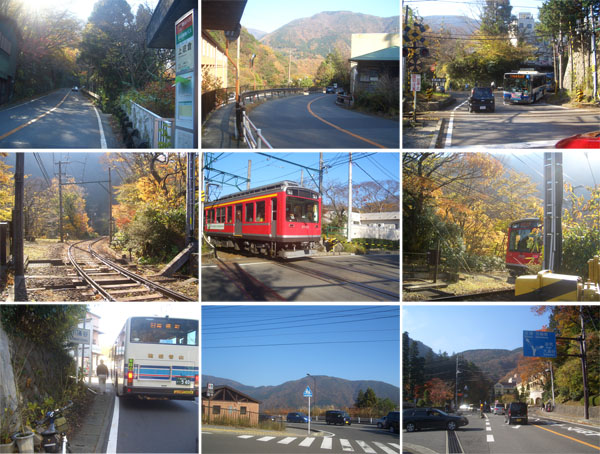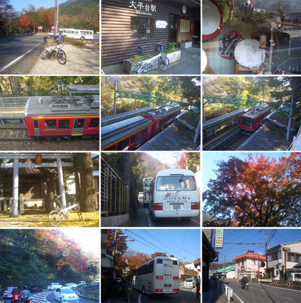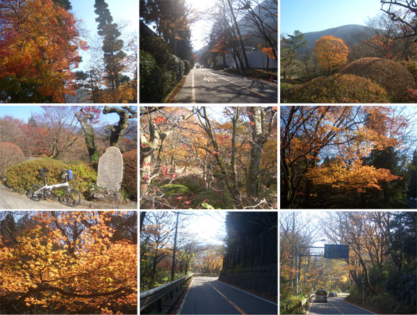 大きなヘアピンカーブが現れてひとのぼりすると大平台駅前にでた(0940)。ここでまた自転車を停めて駅舎の中に入ってみる。ホームを見下ろしてみるとちょうど電車が発車するところだった。隣の山神社?の銀杏が綺麗だったので写真撮影。このあたりから渋滞がひどくなってきた。道も狭くバスも多いので脇をすり抜けることも困難になってきた。富士屋ホテル前からバスが一台バックしてきたので停止。ほどなく宮の下の交差点にでる(0958)。直進すると仙石原、乙女トンネル、御殿場方面だ。