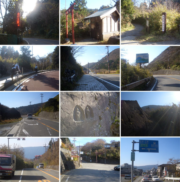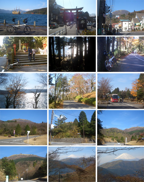 寒くなってきたのでウィンドブレーカーを着て出発。箱根神社前を抜けて箱根ロープウェイ方面にすすむ。龍宮殿ホテル前を右折してやや長めの坂をのぼり県道にでる。左折するとアップダウンのある道となった。駒ヶ岳を見あげたり芦ノ湖越しに富士山を眺めたりしながら走行していく。ハイキングコース入口はまだかと注意しながら進むとようやく到着(1220)。