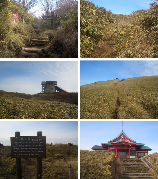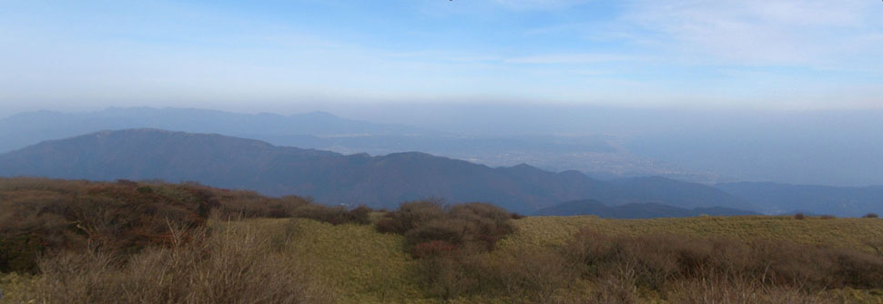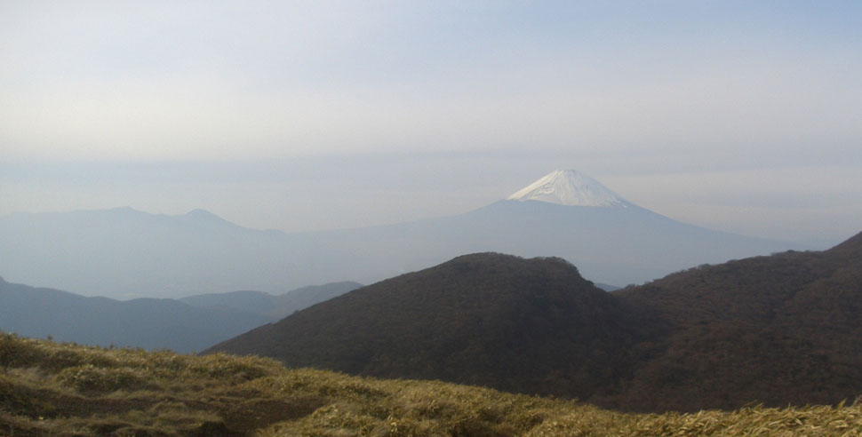 このあたりまでくるとだいぶ空が開けてくる。ここで5分ほど休憩。横に小川がちょろちょろと流れている。駒ヶ岳が右手に見えてきたが風が吹き荒れている感じ。ここまでは森の中だったのでほとんど影響なしだったが山頂付近は吹きさらしなのでちょっと心配。前方から二人組が降りてくる。山頂での風はどうかと訊ねるとロープウェイも運休していてすごい強風とのこと。ほどなくロープウェイ方面との分岐地点に到着すると後ろから二人連れのハイカーがやってくる。挨拶後山頂方面に向かうことにする。熊笹をかきわけてのぼっていく。もの凄い風が吹いていて吹き飛ばされそう…。しばらくすると左手に富士山が神山?越しに見えた。遠くは霞んでしまっていたがなかなかの眺めだ。山頂付近にでると岩がごろごろとしていたり神社があったりと結構広い。とりあえず神社までのぼると駒ヶ岳(標高1,357M)という立て看板がある。どうやら山頂に到着したようだ(1400)。神社脇から相模湾や丹沢方面が望めた。