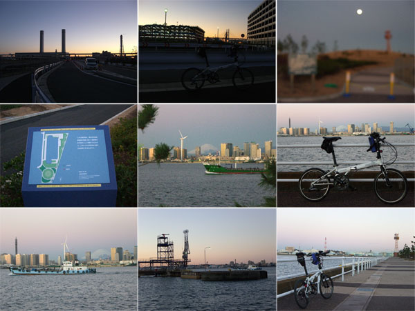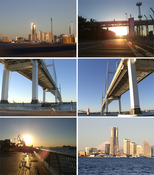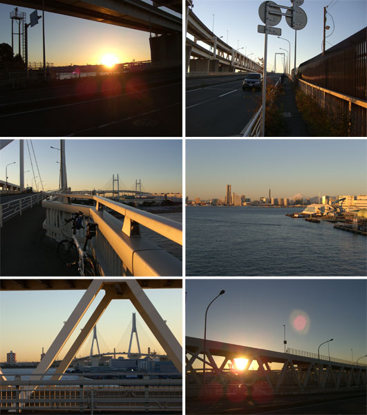 大黒大橋をのぼっていくとちょうど左手の建物ごしから陽が昇ってきた。やや風が強めだが12月にしては気温も高めなようでなかなかすがすがしい気候だ。下の海面をぞきこむとちょっと怖い…。揺れるし…。