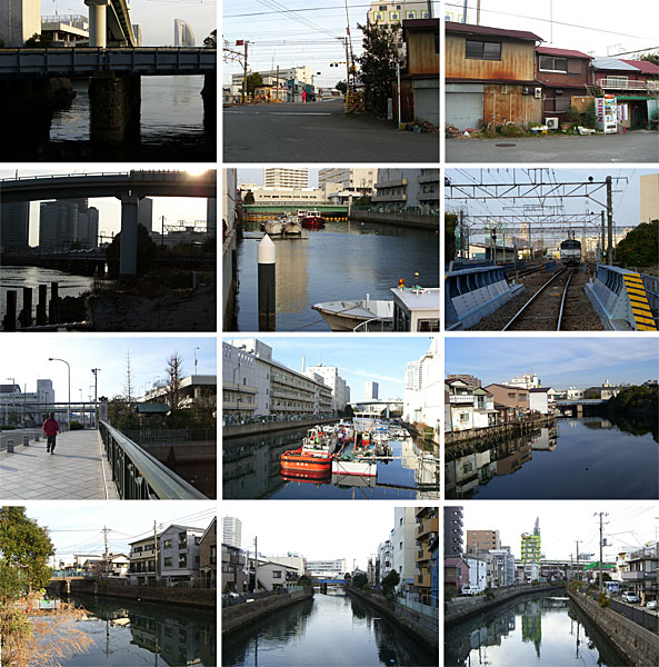 ポートサイド公園の反対側、貨物列車の通る高架の向こう側が新しい河口ということになるのだろう。このあたりは中央卸売市場と建物によって両岸はほぼ塞がれてしまっている。踏切手前の横道へ少し入っていくと川面を見ることができた。踏切を渡り右手に万代橋、道路を横断して幸橋から上流をのぞむと右岸の家屋が川にはみ出して建築されている…。ここも川沿いに道はないので通りに戻る。信号を右折すると綿花橋。