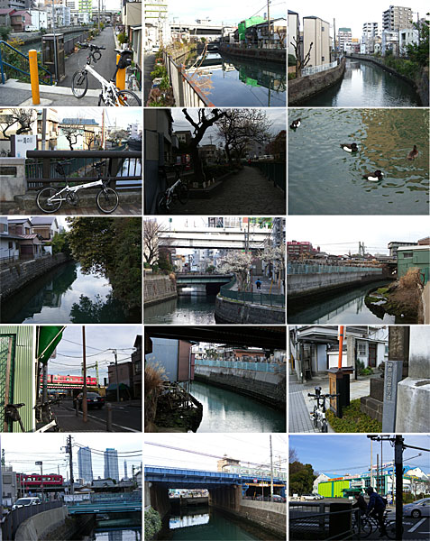 左岸側に短い階段があったので自転車を担いで降りる。このあたりが江戸時代の河口で砂浜だったのかな? 滝の橋でR15号線を横断する。右岸に石畳の短い遊歩道が続いている。先週満開だった梅も今日はやや見頃をすぎた感じとなっていた。土橋を渡り通りへでる。川の対岸にお墓が見える。右手には慶運寺といううらしま太郎に関連する寺がある。京浜急行やJRの高架下をくぐると二ツ谷交差点(境橋)。ここから滝の川は暗渠となって消えてしまう。