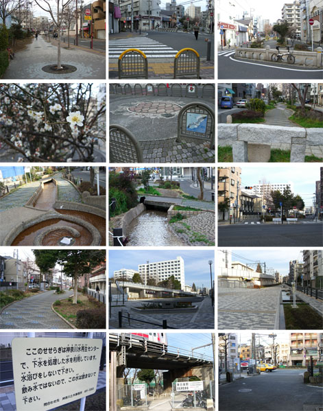 大通りを横断して神奈川スケートリンク横を抜けていく。二ツ谷橋跡から滝の川せせらぎ緑道が整備されている。緑道は自転車で通行すると迷惑そうなので側道を走行していく。再び大通りを横断するとほどなく二ツ谷公園。ここから東急東横線が地下に潜っていくのが見える。広場を抜けて上麻生線にでる。東白楽駅前の駐輪場のあたりに橋の跡がある(平川橋)。