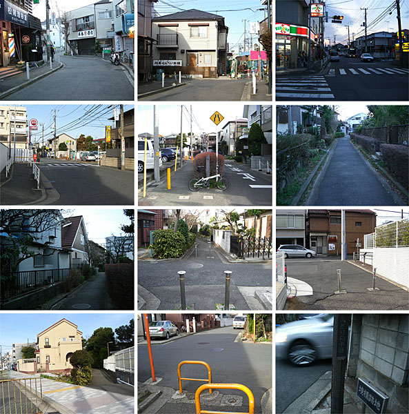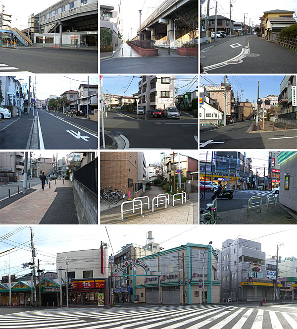 駅前で通りを横断し駐輪場横に川跡は続いている。古い地図によると交差点ごとに一之橋、二之橋、三之橋となっていた模様。住宅地を抜けていくと六角橋交差点にでた。通りを横断して振り返ると六角橋商店街が見える。