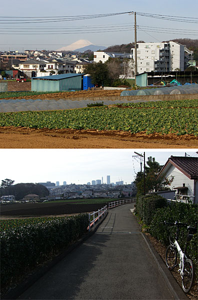 道幅が広がり住宅地の中をすすむ。ちょっとよりみちということでコンビニ手前で分岐している坂道をのぼってみる。途中で右折して細い道をさらにいくと畑が現れた。振り返ってみると丘ごしにみなとみらいのビル群が見え右手には丹沢・富士山の山並みも見えている。