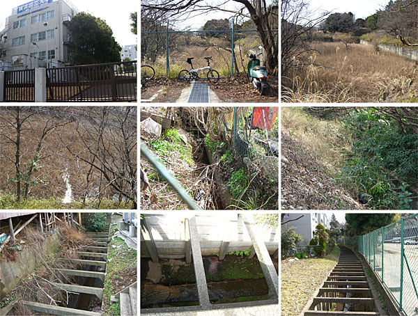 大池道路の西釜台バス停付近で左折し横浜国立大学北門まで下る。地図でみるとこのあたりが反町川(滝の川)の源流っぽい。大学内に入ってみることにする。右手の金網越しに湿地帯のようなものが見えた。ここが源流なのだろう。自転車を駐輪場に止めて柵のまわりを半周してみる。ということで反町川を下流に向けて辿ってみることにする。通りに沿って流れているようだが建物があるのでところどころからしか見られない。