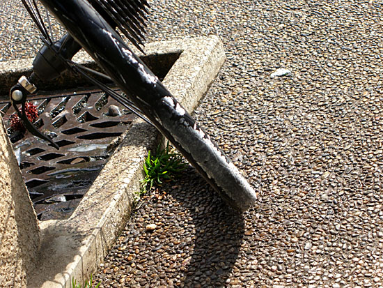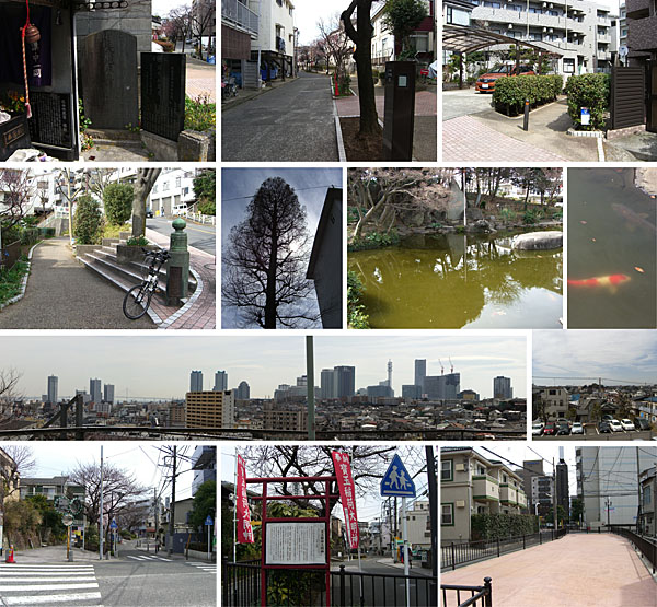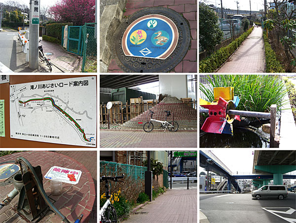 島田橋で大通りを横断して川沿いらしき左側の道へ進むと延命地蔵尊などというお地蔵様がある。さらに先のガーデン橋からちょっとよりみちということで坂道をのぼっていく。ガーデン山団地に入って奥へ進むと柵がやや邪魔ながらもみなとみらい方面やベイブリッジが見渡せた。案内図に池のようなものがあったので立ち寄ってみる。こじんまりとした池に鯉が泳いでいた。再び滝の川跡に戻る。なにか嫌なものを踏んづけたと思ってタイヤを見ると白ペンキが…。なんでまたこんな所に…。ちょっとショックを受けてその後写真を撮り忘れてしまった。その後のルートは東横フラワー緑道と交差して国道を横断し反町公園と神奈川スケートリンクの間を抜けて二ツ谷で滝の川と合流といった感じ。