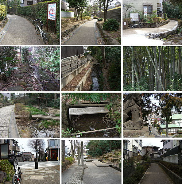 さらに進んでいくとコンビニエンスストア前(神奈川大学入口)にでる。この先ちょっとわかりにくくなるがさえぐさ動物病院の看板を右折すると(宮面橋)六角橋緑の小径というものがあるがこれが滝の川の跡らしい。民家の裏をぐねぐねとぬうようにすすむ。六角橋西町バス停前でいったん大通りにでてしまうがすぐに右へいく小径が続いている。境橋という表示がありここで緑の小径は終わりらしい。